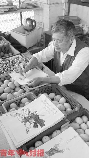 85岁老伯边卖鸡蛋边画画 买鸡蛋可获赠水彩画(图)