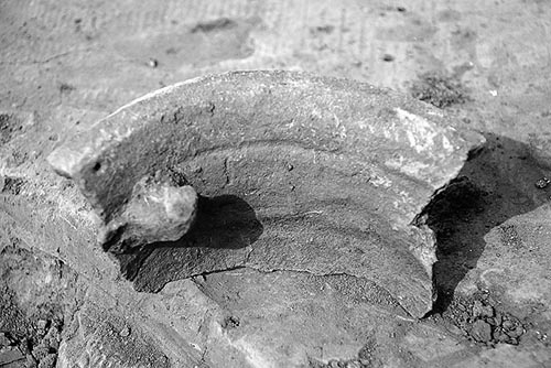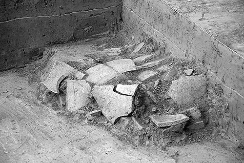 在遗址的北侧,几个村民探着头朝着一个探方内正在挖掘的坑不停地看,记者上前一看,只见其为长约2.6米,宽1米左右的土坑,在它的边缘还有一些灰色的像“砖”一样的东西。康三林告诉记者,这是一处汉代的陶窑,全部挖掘完以后,长2.6米,宽约1.95米,深约1.43米,目前只挖出了一半,火堂、窑门和操作间还没有挖掘出来。据康三林介绍,在这处陶窑的东南约3米处的探方内发现的陶片有规律地摆放着,估计是一个加工陶的小作坊。
