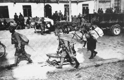 日军在南京大肆抢掠,军用卡车、骡马车、自行车,甚至儿童车也成为其运载赃物的工具。