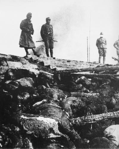 把人从货车和仓库拉出来,共1200人,让他们面朝江水坐在没膝盖的泥土中。命令一下,躲在后面战壕里的重机枪就一齐开火。他们便像骨牌一样倒下去,血肉横飞。跳进河里的数十人被等在栈桥上的轻机枪全部打死,鲜血染红了泥水。