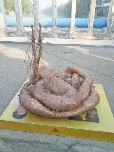 记者来到丹阳路洗耳河桥头处,只见这里卖山药的摊点有好几个,一大群人围着其中一个卖山药的,七嘴八舌地在议论着一块盘形山药。记者注意到,这块山药形状确实比较奇特(如图),两根山药长在了一起,盘成直径40多厘米的圆形,山药的两根茎并排向上翘着,像是盘着的两条龙在翘首观望。