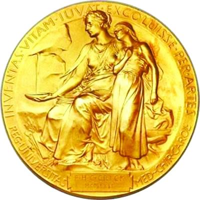 诺贝尔奖的金质奖章约重270克,直径约为6.5厘米,正面是诺贝尔的浮雕像,不同奖项的奖章背面图案不同,每份获奖证书的设计和词句也都不一样。生理学奖/医学奖的奖章背面雕刻着医药之神,膝盖上放着一本打开的书,正在从岩石间汲取泉水来治愈一名患病的少女。