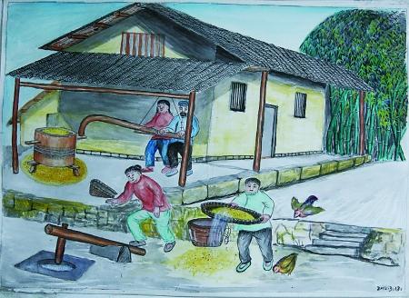 “现在没人用草纸了,那时候纸坊就用竹子做纸。”在《做舀纸》一图中,记者看到,人们将竹子放进石灰水里浸泡。“泡上半年多,碾碎,放水里煮,再舀出来,用筛子过滤纤维……最后晾晒成纸。”