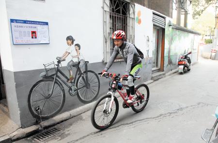 ↑一个自行车爱好者骑过小巷,与墙上怀旧的骑车插画相映成趣。