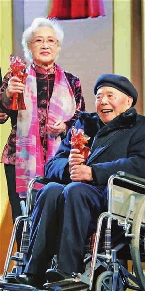 ▲ 文艺理论家钱谷融(右)、电影表演艺术家秦怡在第六届上海文学艺术奖领奖台上 本报记者 郭新洋 摄