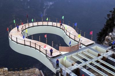 11日,重庆云阳龙缸景区悬挑玻璃景观廊桥最后一块玻璃顶推成功,标志着该廊桥正式建成。廊桥位于海拔1123米的爱之路绝壁之巅,悬挑支出长度为26.68米,离地高度718米,采用无钢架支撑,廊桥地面、护栏采用全通透超白玻璃制作。 新华社发