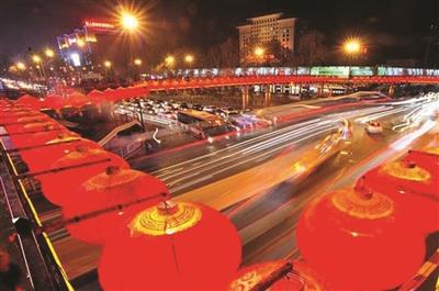 2月23日夜,陕西西安,大红灯笼装点环形桥。