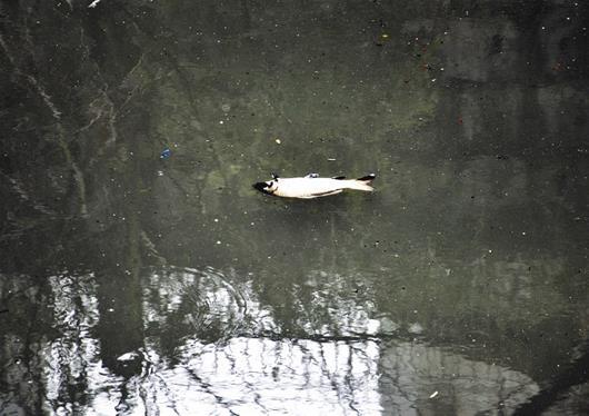 黑黑的水面漂着死鱼。本报记者朱敏 摄
