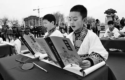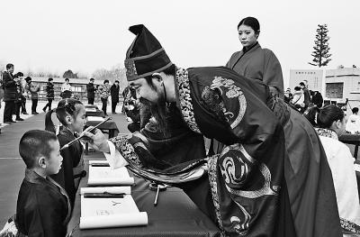 西安举行开笔礼 儿童着汉服、行汉礼、书汉字(图)
