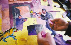 李运正老人用染色纸片创作手撕画 记者 王健 摄