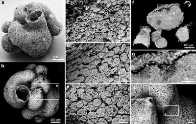 b-e、h为扫描电镜照片,f-g为同步辐射数字切面,f切面在标本中的位置见左下图e中的标记。