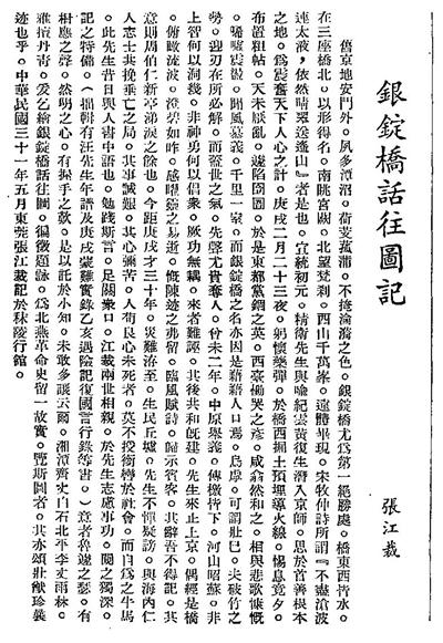 从“银锭桥话往图记”到“庚戌桥史考”,张江裁与刘振卿合作之翻案文章,与其说是出于掌故学者的历史考据癖,不如说是为了迎合1940年代沦陷区的政治局势及他个人的出处选择,刻意凸显汪精卫作为革命志士、开国功臣的“英雄形象”,为汪伪政权寻求“中国民国开国前革命史”上的凭据。作为革命史迹的“庚戌桥”,说明掌故学家打捞的历史风土中难免混入政治的尘埃。
