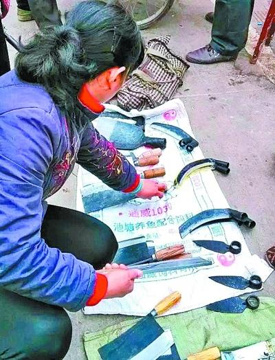 丁爹爹的地摊上除了菜刀,还有割草刀、锄头、点种用的铁尖等。丁爹爹说他打铁有六十几年了,现在虽然不以此为生,但打铁的手艺也没闲着,家中的打铁炉子基本上不熄火。“以前打铁的人很多,但坚持到现在的已经很少了。现在菜刀农具什么的在超市都能买到,但还是有很多人钟爱这种原始手感的铁刀。”