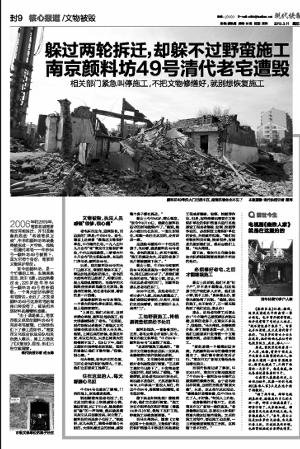 连日来,现代快报报道了南京市级文保单位颜料坊49号古民居被毁一事,引起了社会的强烈关注。昨天晚上,南京市文广新局官方微博“@南京文化发布”发布信息,称经过南京市文广新局案审会的审理,决定对施工方罚款50万元,要求建设方待文物修缮通过验收后才能恢复施工,另将案件线索移交公安部门。