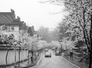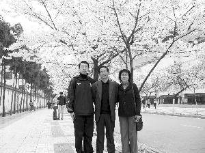 2008年春天,他在微雨中再次步入鸡鸣寺路,“沾满水珠的樱花重重地低垂着,竟有了分垂丝海棠的妩媚,在市政府老楼的映衬下,构出最美的风景。”那一年,一个晴朗的周日,他们全家又去了南林大赏樱。
