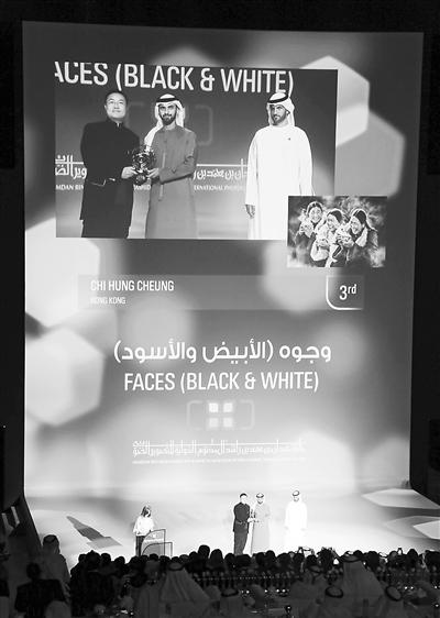总奖金达40万美元的第四届迪拜哈姆丹国际摄影大赛近日在迪拜国际金融中心揭晓。图为来自中国香港的摄影师张志雄(左)上台领奖,现场大屏幕上投射出颁奖瞬间和获奖作品。