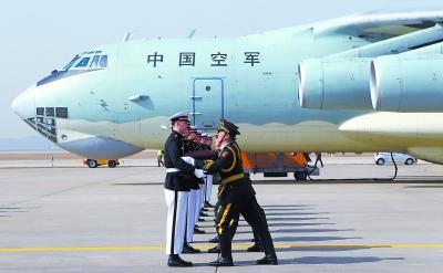 今天上午,在韩国仁川国际机场,中国驻韩大使邱国洪(前左)为中国人民志愿军烈士遗骸棺椁覆盖中国国旗。