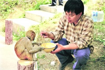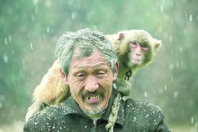 下大雪,猴子不愿意走路,杨林贵就把猴子背在肩上
