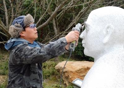 此外,用山东白麻雕刻出来的“鉴真东渡”群雕,与原先的设计群雕泥稿方案一致,使用了抽象艺术表现手法,塑造了鉴真刚毅不屈、勇往直前的精神状态。但在人物面部表情以及整体线条上,刻画更加细腻,尤其是鉴真大师的面部塑造传神,双眼更加炯炯有神,面部表情更加慈祥。“面部表情和双眼,是用凿子一凿一凿凿出来的。曾经因为发现神情不对,又重新选材雕刻。”