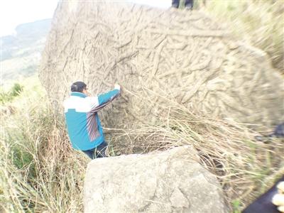 下车步行十几分钟后,在一条杂草丛生的小道上,一块巨大的化石出现在众人眼前。大家纷纷拨开枯草,迫不及待地一探究竟。