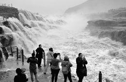3月25日,游客在山西吉县黄河壶口瀑布欣赏气势磅礴的“桃花汛”。当日,受气温回暖和上游融冰开河影响,吉县黄河壶口瀑布“桃花汛”如期而至,每秒流量达到1260立方米,形成百米壮观瀑布群,气势磅礴,吸引了众多游客。桃花汛,指黄河在宁夏、内蒙古河段在春季三、四月份因冰凌融化形成的洪水。因其流至下游时,恰逢沿岸山桃花盛开季节,故称“桃花汛”。本报拍客 吕桂明摄影报道
