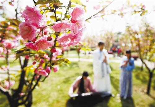 3月25日,西政渝北分校岭南樱花园,该校笛箫社的同学身着汉服在樱花树下演奏乐器。 特约摄影 苏思