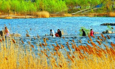 清明小长假第二天,在莲石湖畔,许多市民驾车前来这里,享受春天游湖踏青的快乐。