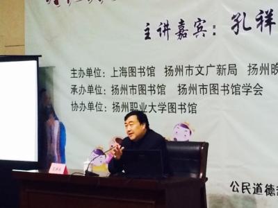 昨天下午,《扬图讲堂》公民道德教育系列家风家训专题第三讲,特邀孔子第75世孙、世界儒学大会秘书处秘书长孔祥林围绕“诗礼传家一脉深 文章道德圣人家”这一主题,与扬州市民分享了孔氏家族的祖训与家风。