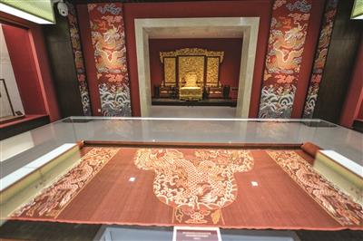 现场展示的各式各样龙袍也格外引人注目。在一处参观者纷纷坐上去留念拍照仿制龙椅前,一块红色的袍料显得并没有龙椅起眼。