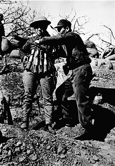 美国著名摄影师罗伯特·卡帕用镜头记录下一名敢死队员在一名老兵的帮助下,把手榴弹绑在身上。资料图片
