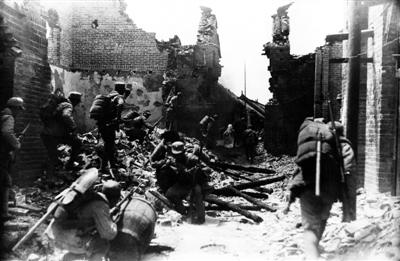 中国士兵进入月河街搜寻日军残余,台儿庄大战最惨烈的巷战就发生在这里。 资料图片