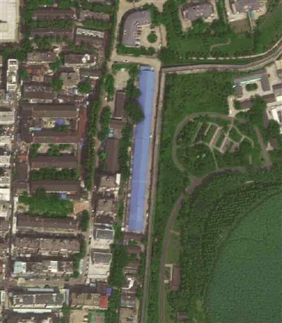 这处房子的屋顶采用天蓝色涂层,与城墙的外观风貌迥异。由于建筑屋顶体量较大,走在城墙上的市民会感到蓝屋顶就在身边。在网上的卫星地图中,可以清晰地看到这片“蓝屋顶”:它紧紧贴着城墙,比城墙更加宽大。