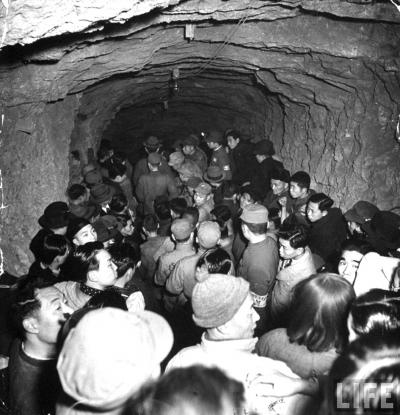 换气装置坏掉了,油灯也渐渐微弱下来,憋闷的空气让人难以喘息,隧道深处的人受不了要出去,往防空洞里钻的民众却越来越多,像潮水一般涌入。狭小的空间里,人流冲撞、挤压着,情绪急躁,哭喊声、咒骂声嗡嗡一片。