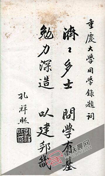 1940年6月,孔祥熙为重庆大学第五届毕业生题词。