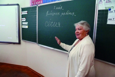 伊万诺沃国际儿童院博物馆馆长库兹涅佐娃在黑板上给一年级学生用俄语标注出中文“谢谢”的发音 摄/法制晚报特派莫斯科记者 张秀晨 吴海浪