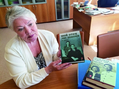库兹涅佐娃老师给记者展示俄语版《我的父亲刘少奇》 摄/法制晚报特派莫斯科记者 张秀晨 吴海浪