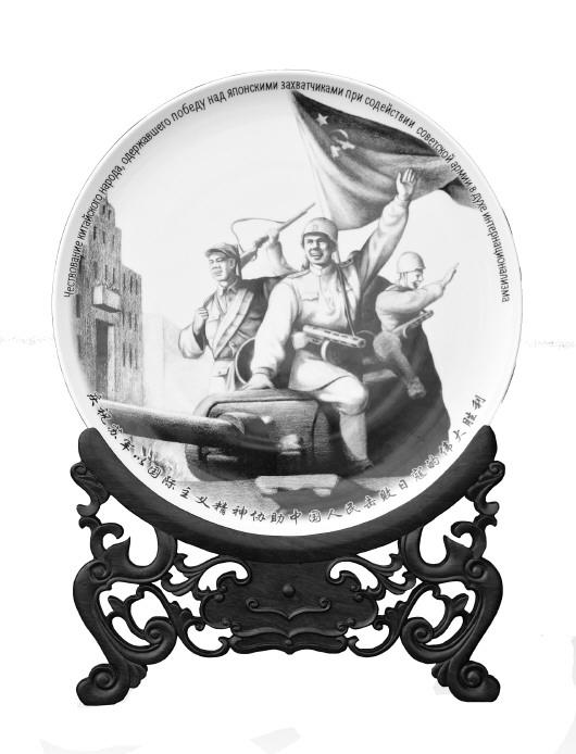 9日,前往俄罗斯参加纪念反法西斯战争胜利70周年纪念活动的中方代表团向俄方赠送了礼物,礼物之一是一件水晶骨瓷盘,印着中苏士兵同庆抗日战争胜利的素描画。这一表现中俄深厚友谊的国礼,是由淄博陶瓷企业制作的。