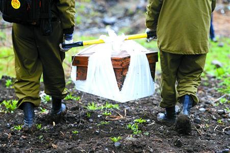 昨天,俄方工作人员将存放4具苏军烈士遗骸的箱子运送到山下。 新华社记者 王凯 摄