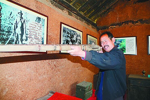 5月7日,记者来到了驴叫村老村部。屋内墙壁上挂满了发生在驴叫村的抗战故事,里面还摆着一位名叫窦永旺的人的生活用品,以及他曾使用过的自制火枪。“这个火枪是老支书窦永旺用过的,他枪法很好,这种枪装上铁砂,一打一大片,可没少让日本兵吃亏。”村支书霍文秀说。