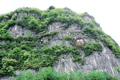 ▲木雕像藏身于绝壁山岩中(红圈处)