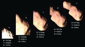 “战神在太空中的运动,就像一个陀螺,还一直翻跟头。”季江徽说, 2012年12月,当“战神”与地球擦肩而过的时候,我国的嫦娥二号择机靠近,并拍下了它首个全身照,揭开了战神的神秘面纱,它长得像一颗多瘤花生,又像生姜,形状很不规则。“一头小一头大,像是两个小天体撞击后形成的。”