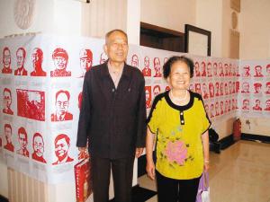 魏永信和老伴在剪纸作品《抗日英雄谱》前合影 (通讯员 杨瑞 摄)