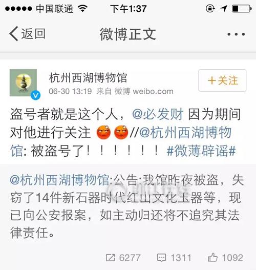 相关阅读:杭州西湖博物馆微博自曝14件文物被盗竟是盗号闹的!