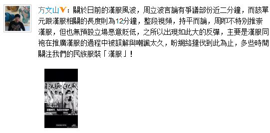 方文山在微博中称:“关于日前的汉服风波,周立波言论有争议部份近二分钟,而该单元跟汉服相关的长度则为12分钟,整段视频,持平而论,周即不特别推崇汉服,但也无预设立场恶意贬低,之所以出现如此大的反弹,主要是汉服同袍在推广汉服的过程中被误解与嘲讽太久,盼网络挞伐到此为止,多些时间关注我们的民族服装‘汉服’!”