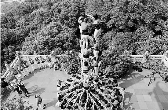 190名西班牙演员在杭州城隍阁表演"叠人塔"(图)