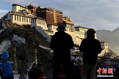 资料图:2015年1月1日,众多中外游客清晨来到布达拉宫观景台拍摄布达拉宫日出迎接2015新年的到来。李林 摄