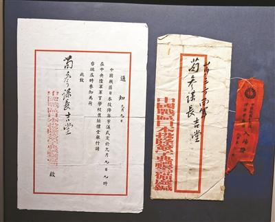在洗脸毛巾的旁边,展示了苟吉堂参加在南京举行的中国战区受降典礼的邀请函。1945年9月9日,中国战区受降典礼在南京中央陆军军官学校大礼堂举行,日本中国派遣军总司令冈村宁次签署无条件投降书,日本中国派遣军参谋长小林浅三郎向中国国民政府军事委员会参谋总长何应钦呈递降书。