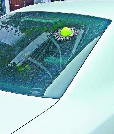 雷人车贴现身:网球“嵌进”车窗 玻璃有白色裂痕