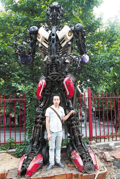 85后用废铜烂铁制作4米高变形金刚(图)
