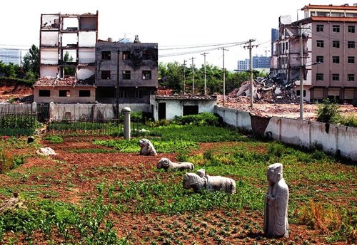 而位于西安长安区的全国重点文物保护单位明秦王陵园,近年来因缺乏监管和保护,陵园重点保护区内的部分秦王墓前神道周围被当地村民开垦成菜地,种上大葱、黄瓜和辣椒等农作物,昔日皇家陵园变成了菜园。